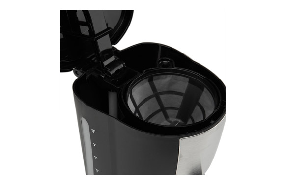 Cafetera de goteo.Capacidad 6 tazas. Filtro permanente extraíble. Jarra de cristal de 0.6l. Jarra y filtro aptos para lavavajillas. Detalles en acero inoxidable. Apagado automático. Depósito con indicador de nivel de agua. Protección anti-goteo. Piloto luminoso de funcionamiento. Placa calorífica anti-adherente. Mantiene el café caliente 30 minutos. Incluye cacillo dosificador. Potencia 600 w. Conexión 220-240 v - 50-60 hz.